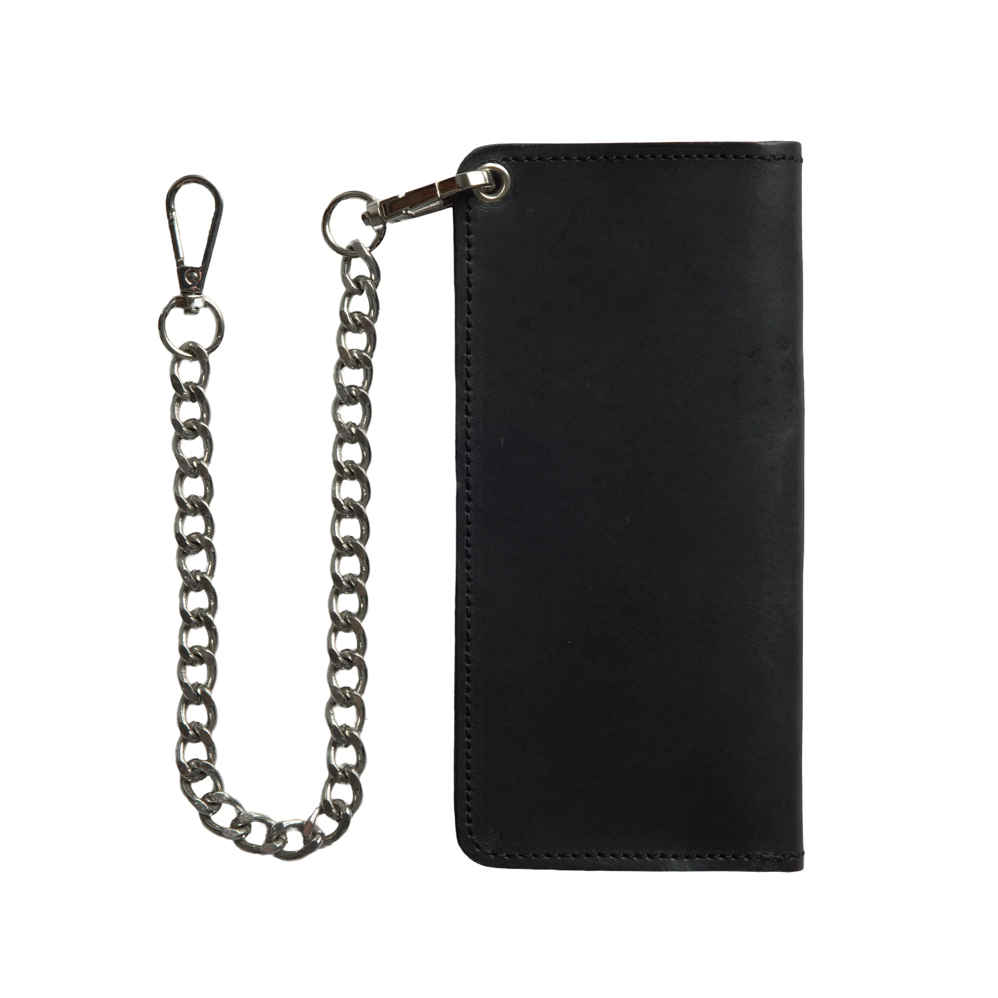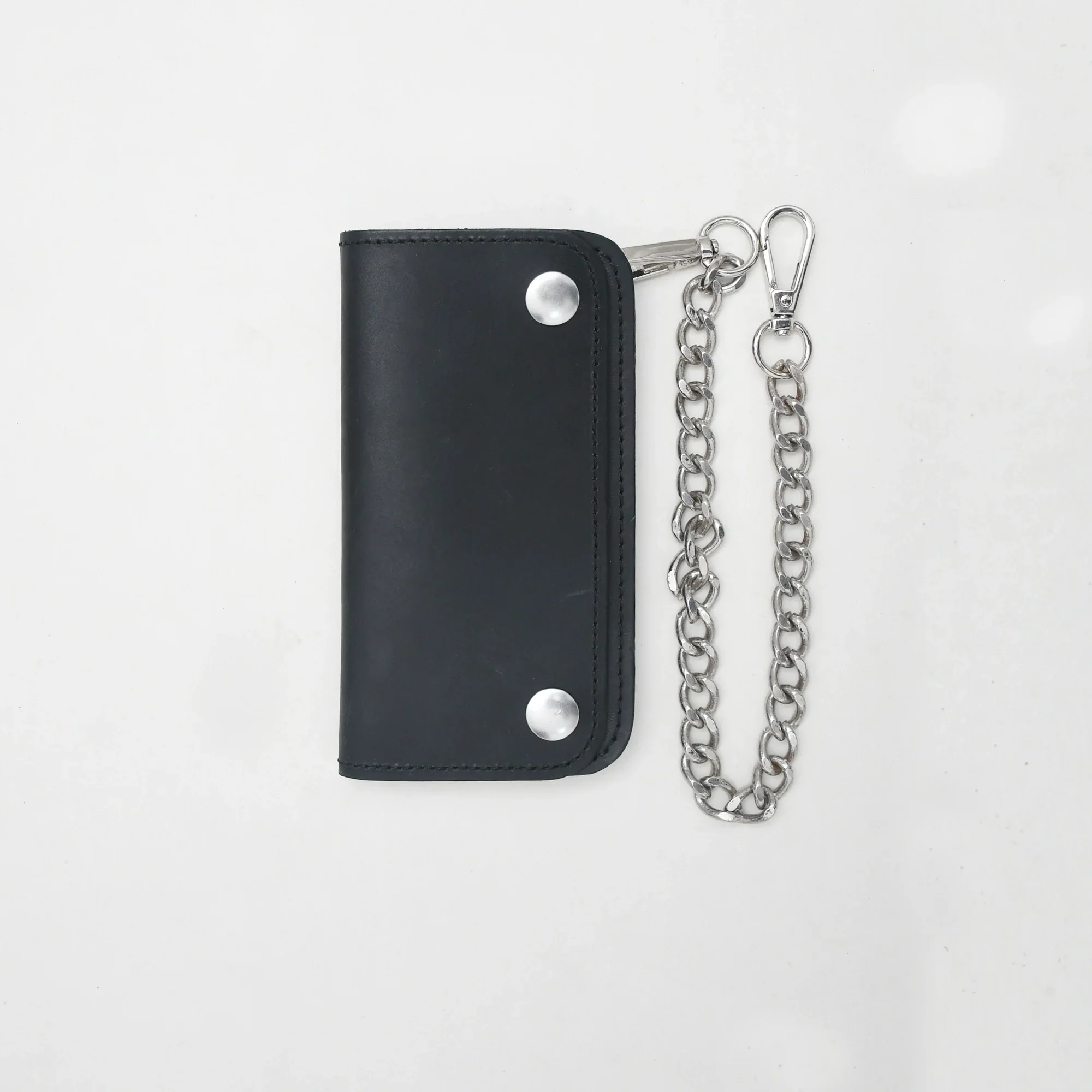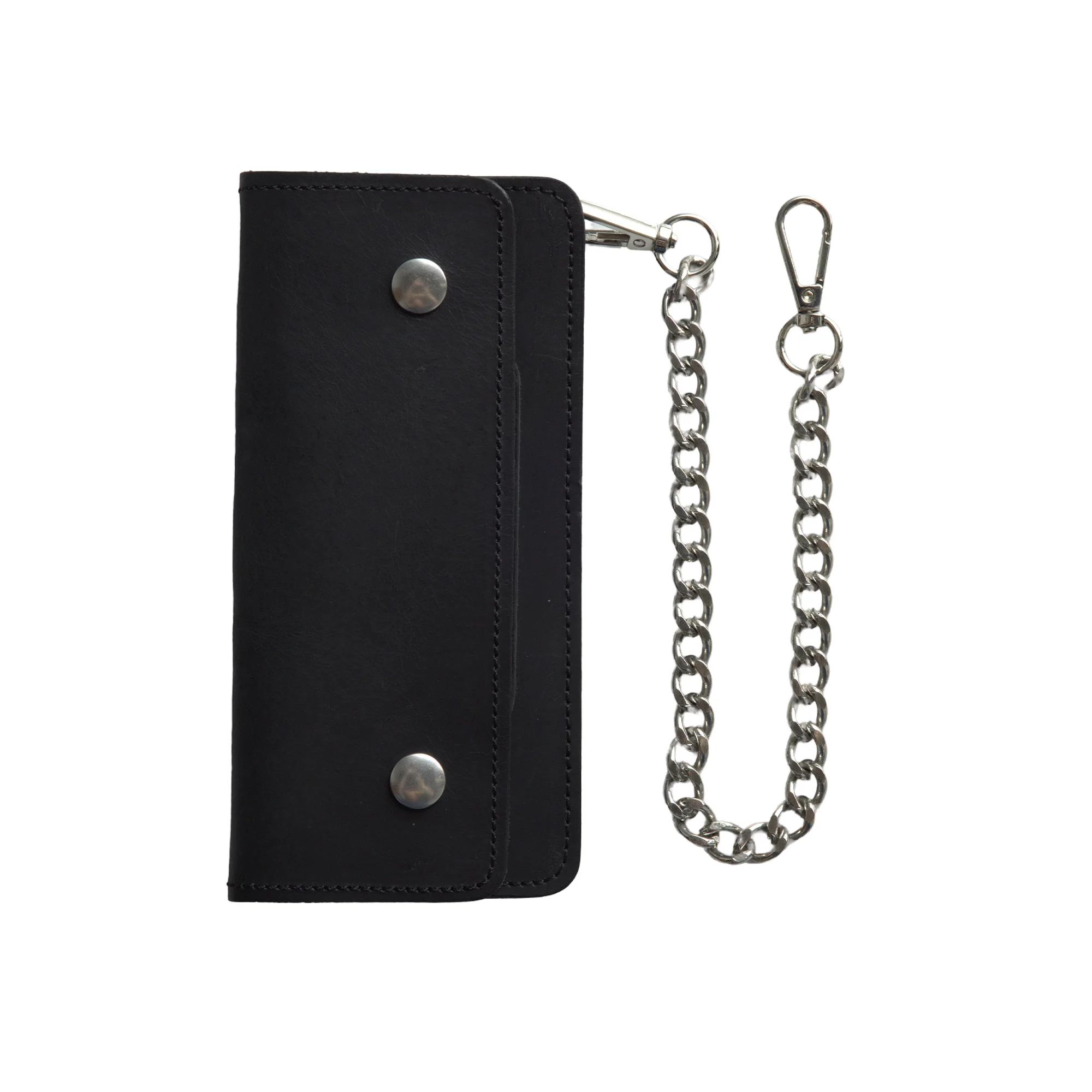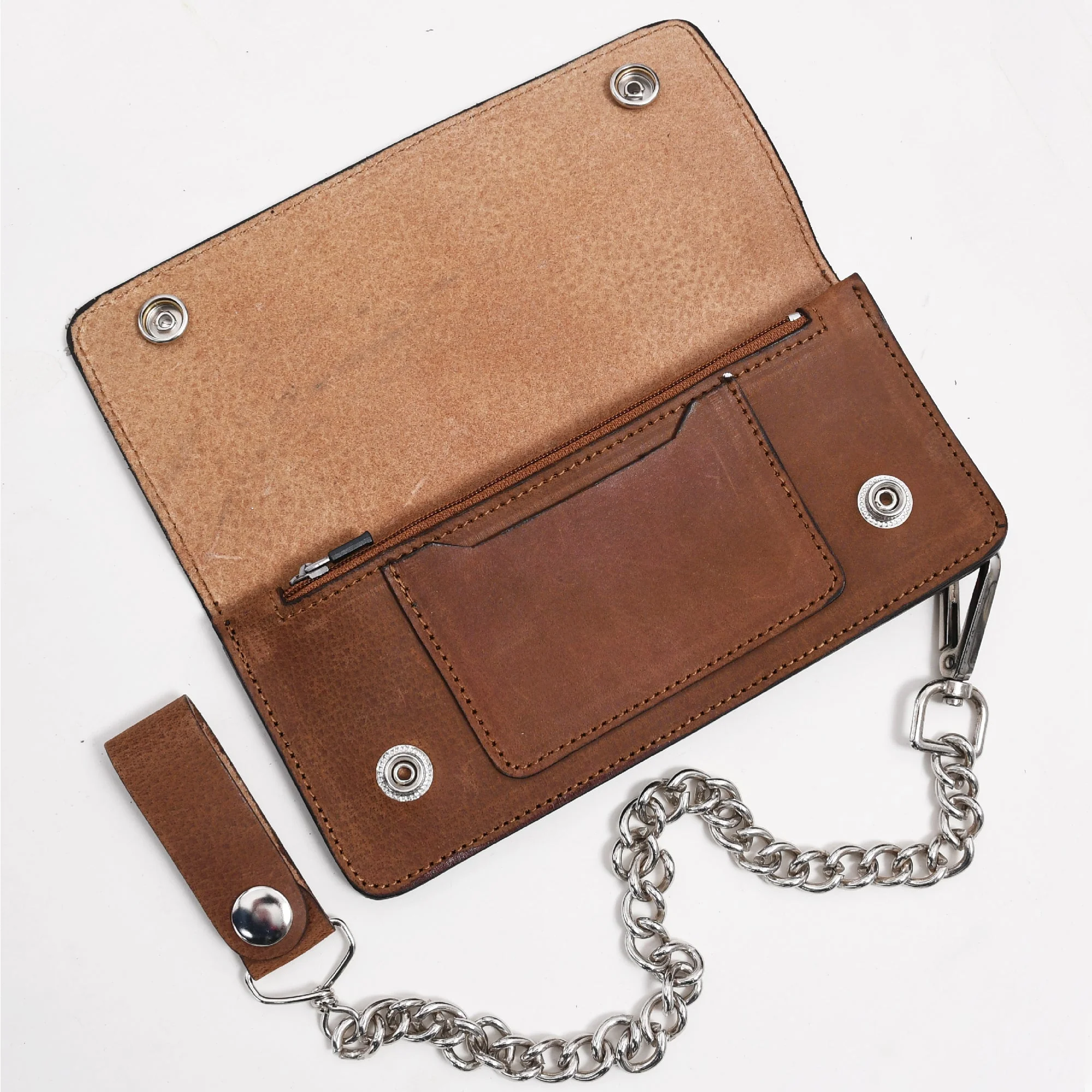 Our Large Trucker wallet makes a statement. This classic style will be visible from the back pocket of most denim and chino style pants. The Large Trucker wallet has more than enough room for all of your everyday items and features one card slot, one zipper pocket, and two large open pockets. We guarantee it will keep your most important items secure behind the double snap closure. The added grommet on the backside keeps the attached rust free chain secure. The 15 inch chain can be removed to replace with one of your choosing or if the occasion requires a cleaner look.