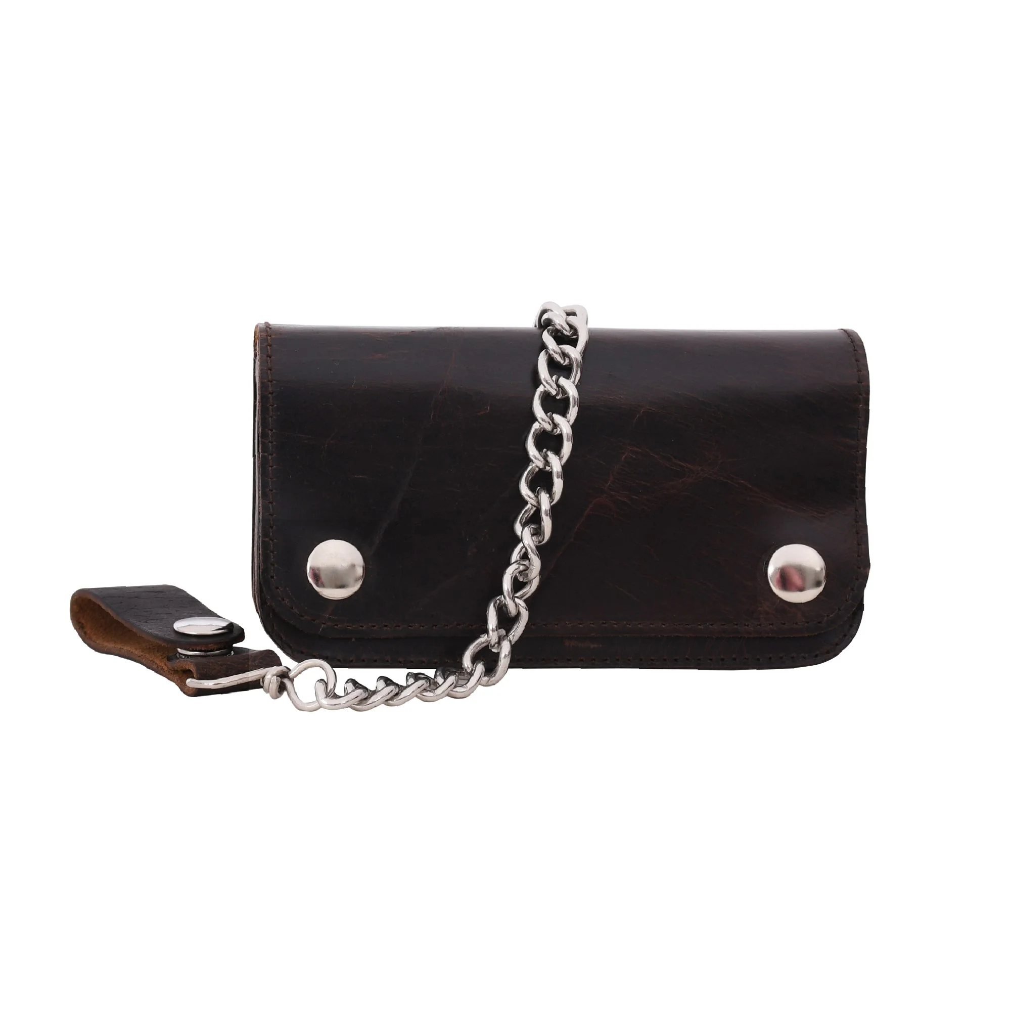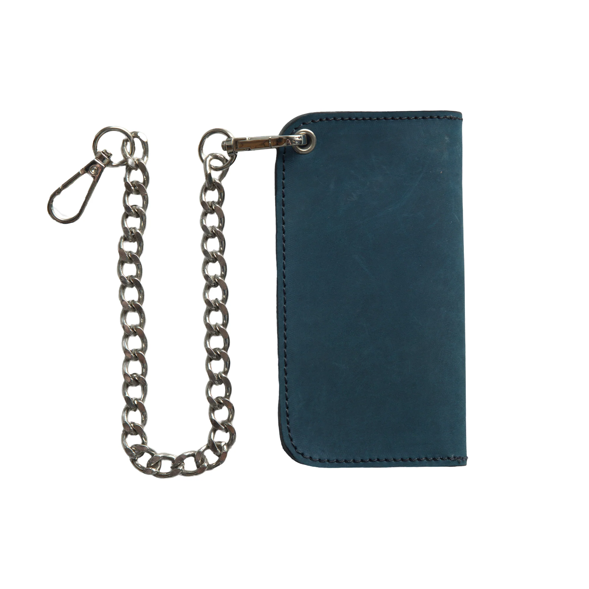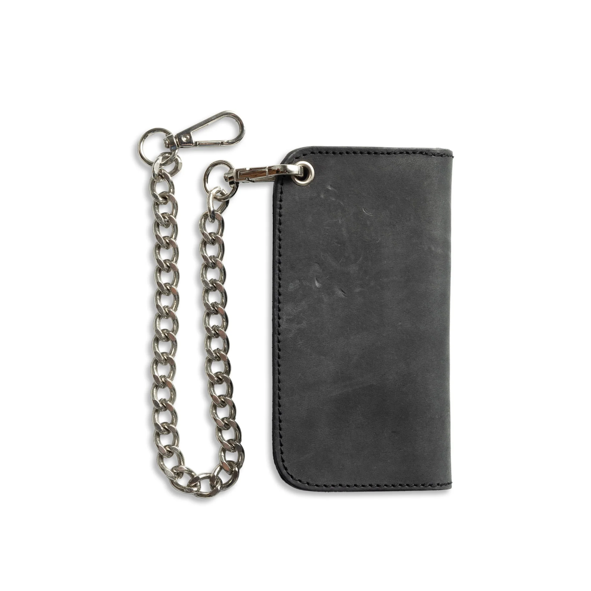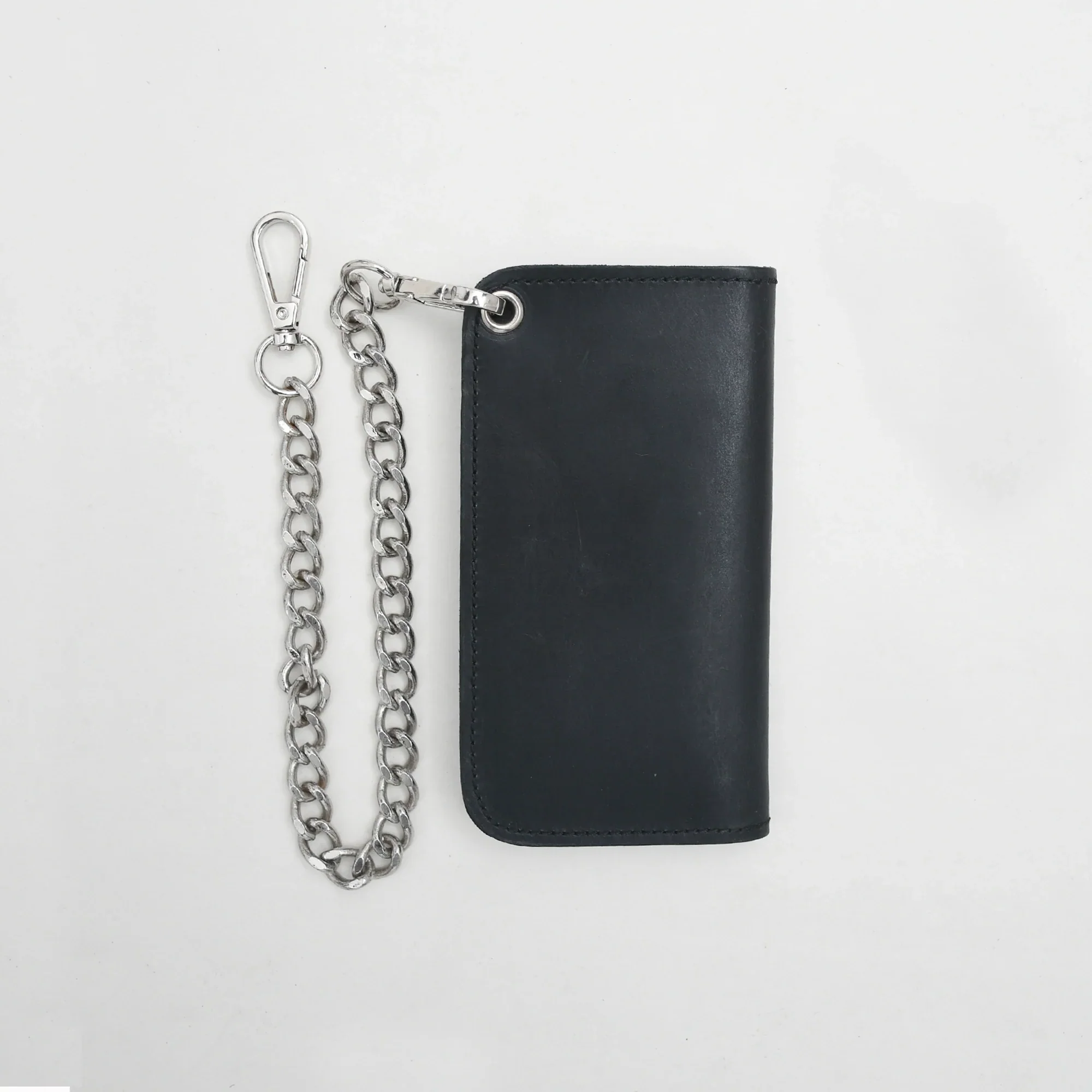 Our Large Trucker wallet makes a statement. This classic style will be visible from the back pocket of most denim and chino style pants. The Large Trucker wallet has more than enough room for all of your everyday items and features one card slot, one zipper pocket, and two large open pockets. We guarantee it will keep your most important items secure behind the double snap closure. The added grommet on the backside keeps the attached rust free chain secure. The 15 inch chain can be removed to replace with one of your choosing or if the occasion requires a cleaner look.