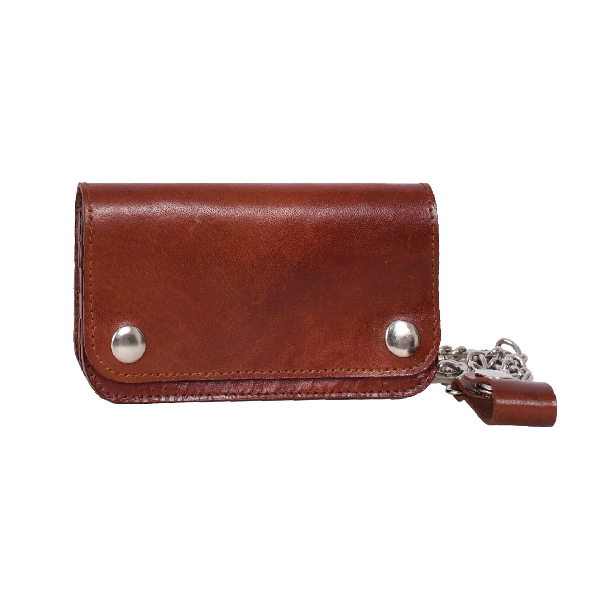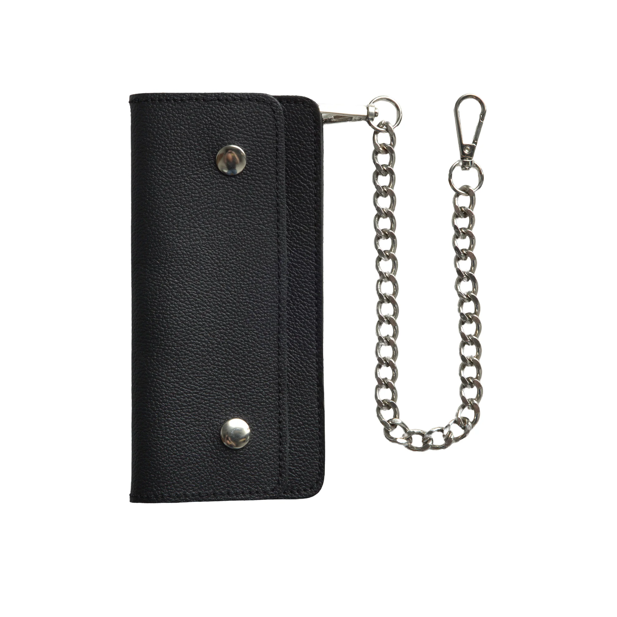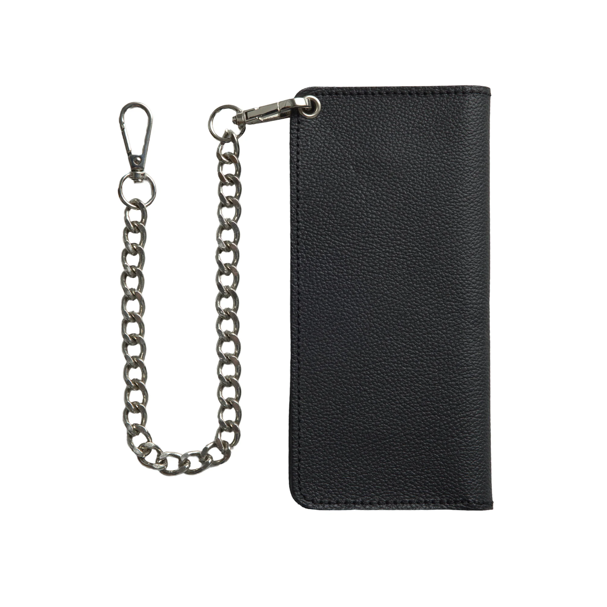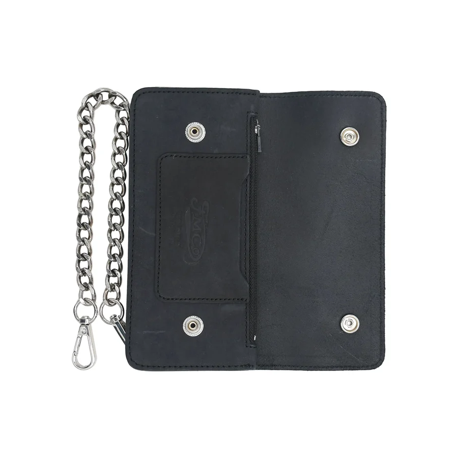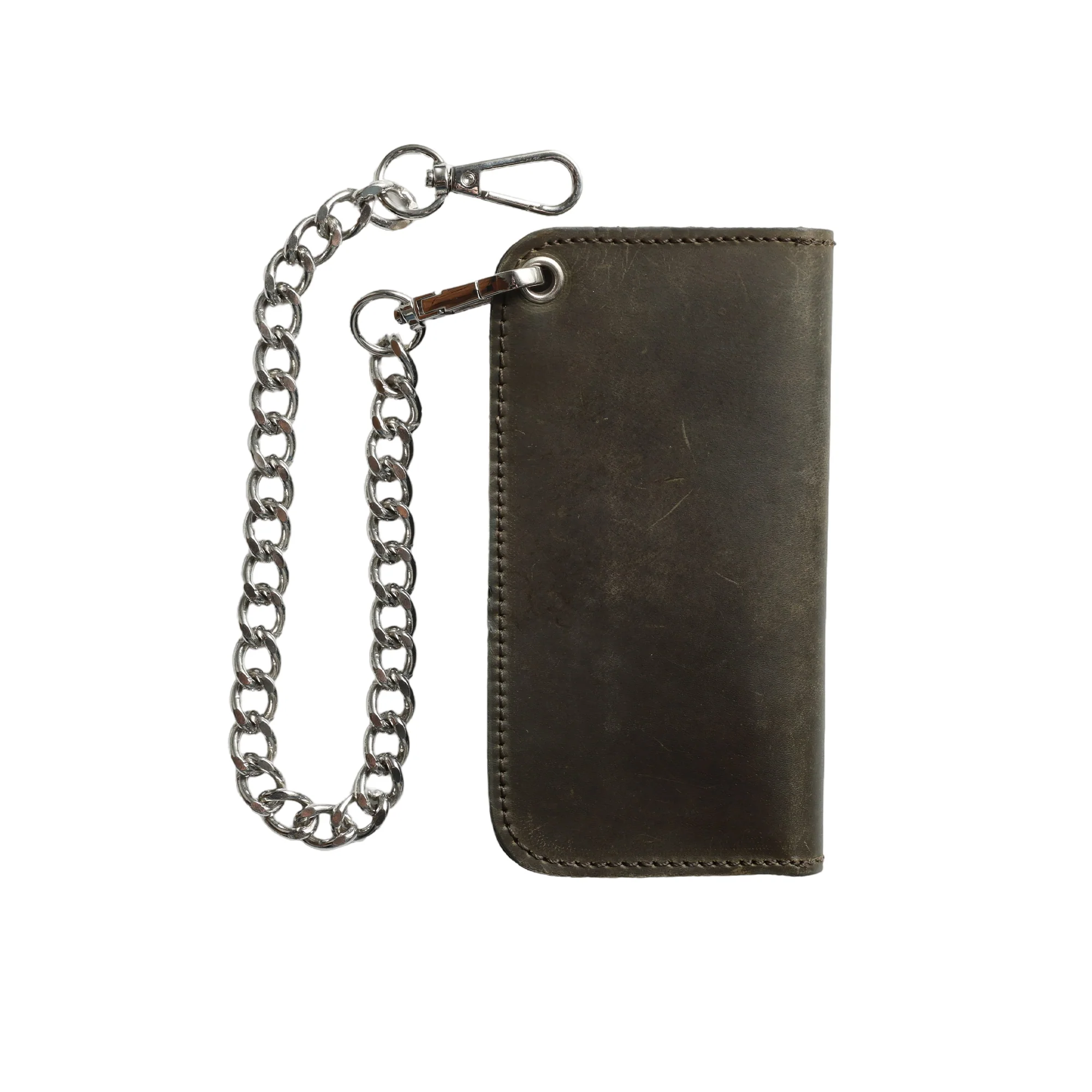 Our Large Trucker wallet makes a statement. This classic style will be visible from the back pocket of most denim and chino style pants. The Large Trucker wallet has more than enough room for all of your everyday items and features one card slot, one zipper pocket, and two large open pockets. We guarantee it will keep your most important items secure behind the double snap closure. The added grommet on the backside keeps the attached rust free chain secure. The 15 inch chain can be removed to replace with one of your choosing or if the occasion requires a cleaner look.