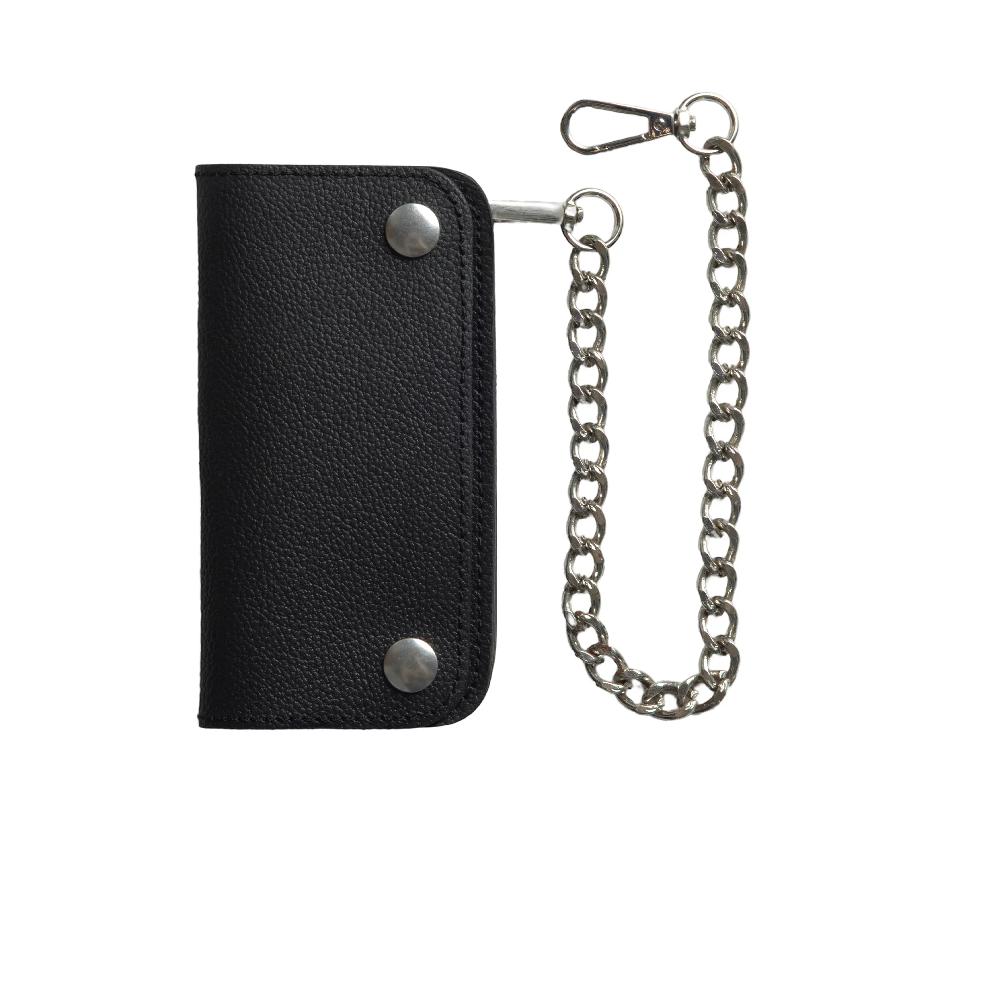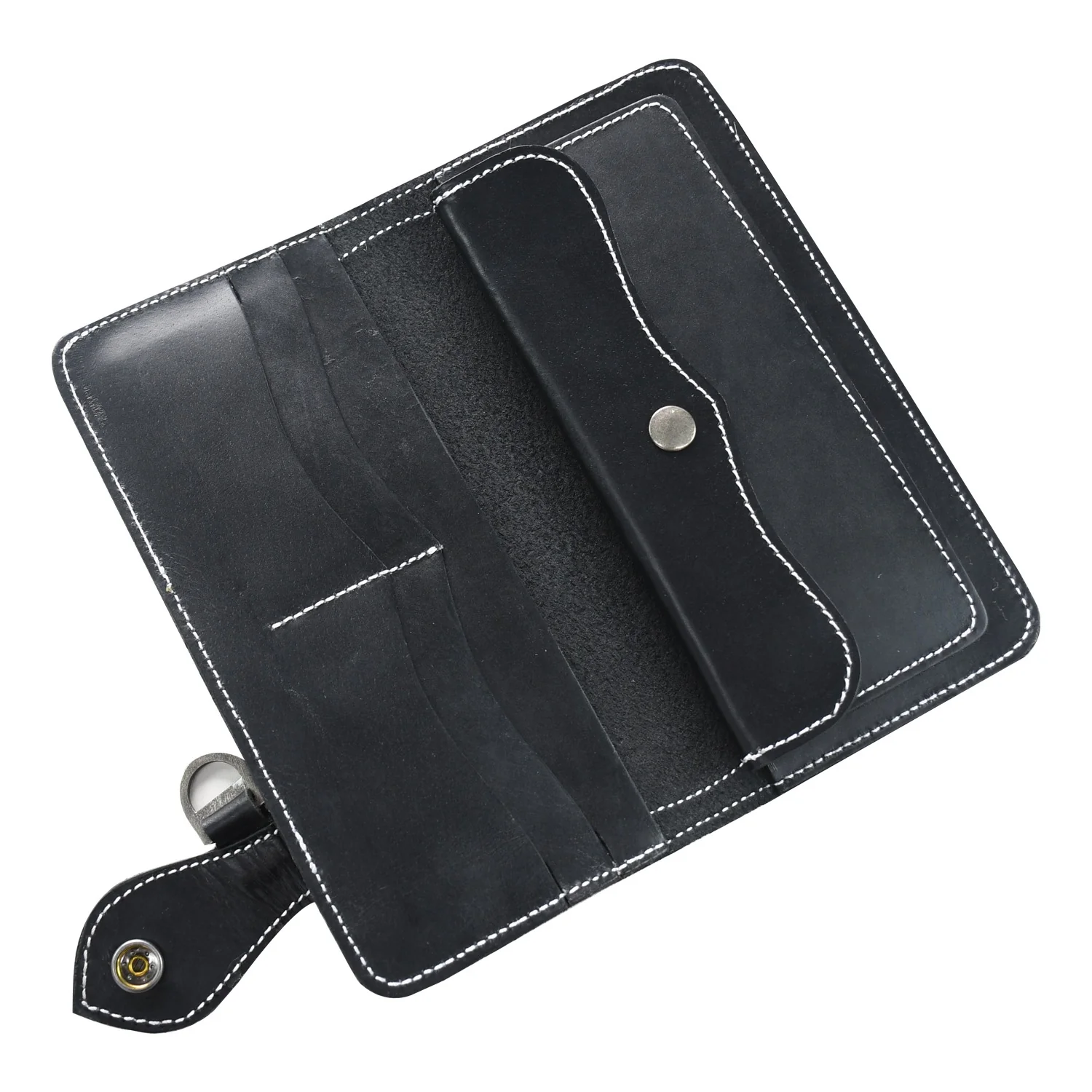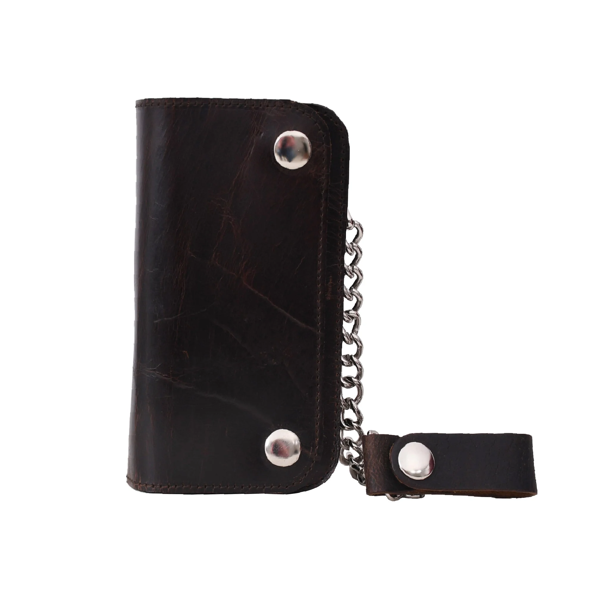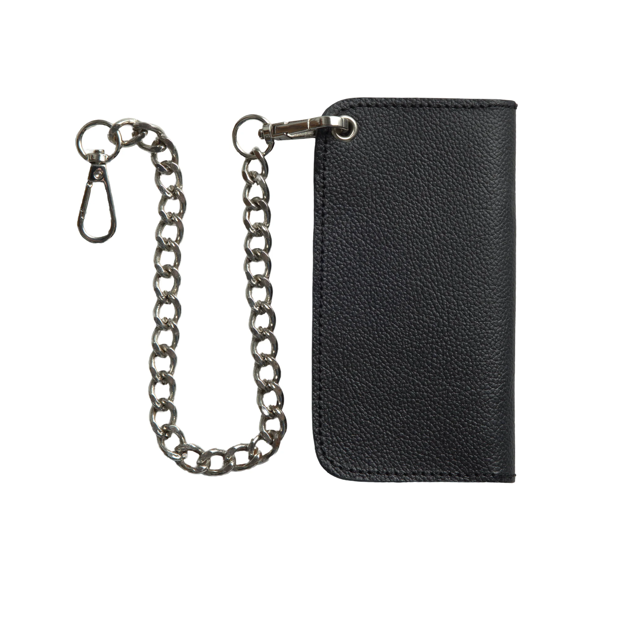 Our Large Trucker wallet makes a statement. This classic style will be visible from the back pocket of most denim and chino style pants. The Large Trucker wallet has more than enough room for all of your everyday items and features one card slot, one zipper pocket, and two large open pockets. We guarantee it will keep your most important items secure behind the double snap closure. The added grommet on the backside keeps the attached rust free chain secure. The 15 inch chain can be removed to replace with one of your choosing or if the occasion requires a cleaner look.