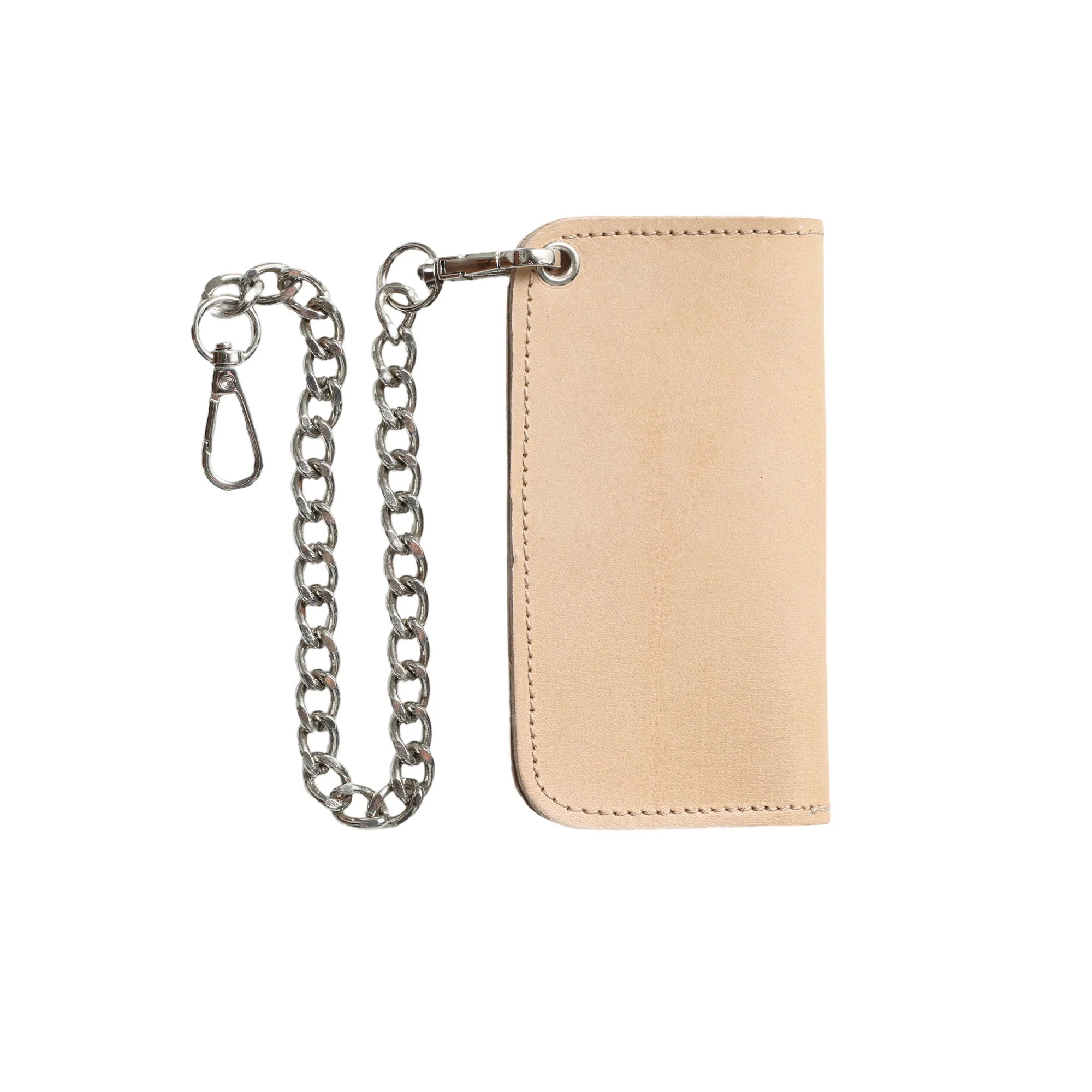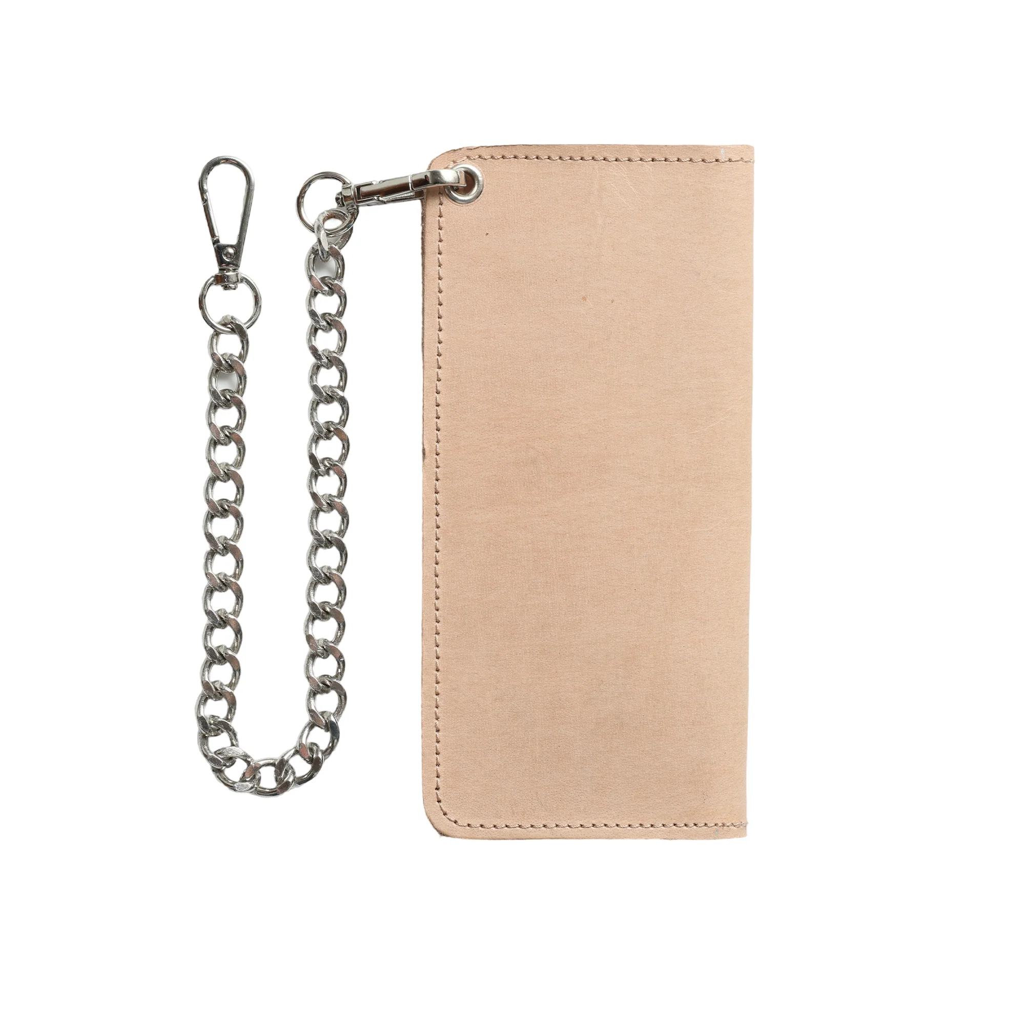 The Large Trucker wallet is the accessory of choice for the confident man who values practicality. This ivory shade is a standout choice, and this wallet's size and proportions make a real impact when visible from the back pocket of your jeans or chinos. Designed to carry your daily necessities effortlessly, it has a single card slot, a zip pocket, and two large open pockets, all protected by a double snap closure for added security. The rust-resistant 15-inch chain adds an edgy touch, but is removable should you desire a slimmer silhouette or prefer to exchange it with your own. This leather wallet for gents is crafted as a byproduct from our belt division so it is a sustainable choice for the conscious consumer.